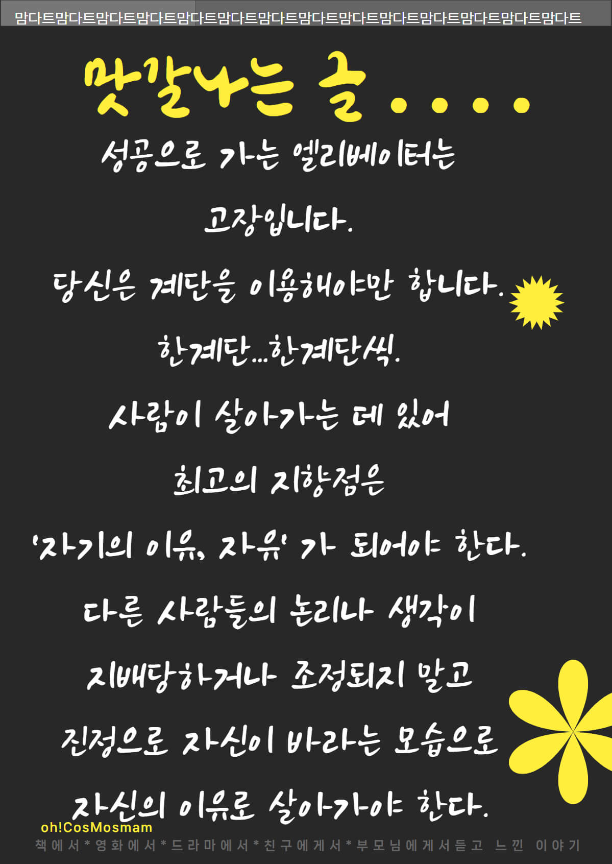♣ 삶의 가치는 속도가 아니라 방향이므로 방향을 재정비하고 오늘보다 다른 발전된 하루하루를 젊은 사람 못지않게 차근차근 만들어가야 하며 너무 자식이나 젊은 사람들에게 의지 하려 하지 말고 차근차근 독립하는 자세로 이뤄내자. 대인과 소인은 방향이 다르므로 아무리 조금씩 변화를 하더라도 한 걸음씩 발전한 대인은 소인과 어마한 품격의 차이를 보인다.