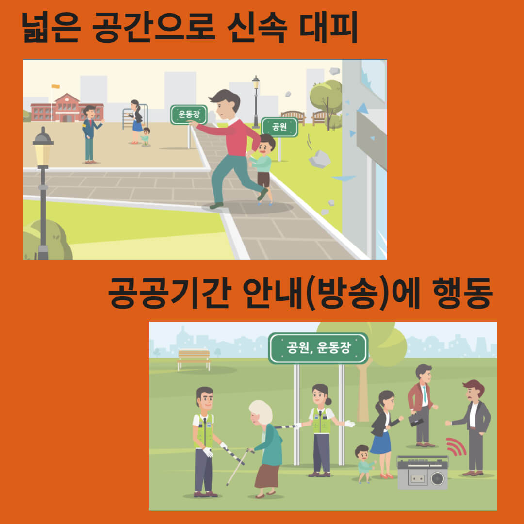 7. 동네 주변 지정된 대피장소나 운동장 등 건물에서 떨어진 넓은 대피장소로 이동 후 공공기관의 안내 방송이나 라디오를 통해 올바른 정보에 따라 행동한다.