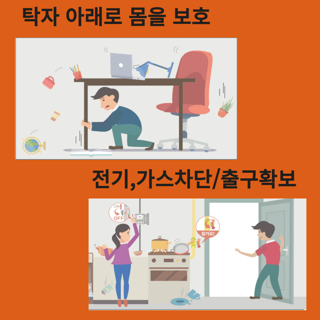 2. 흔들림이 멈췄을 때 전기와 가스를 차단하고 문을 열고 나갈 수 있는 출구를 확보한다.